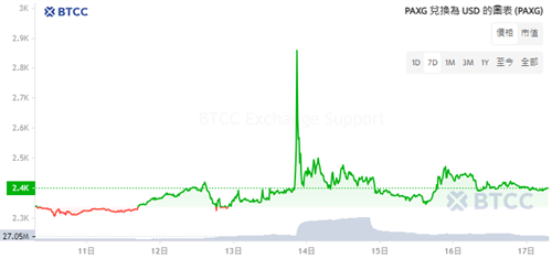 数据表明,在周末的短短时间内,PAXG的价格一路高歌猛进,飙升至2,923美元,相较于週五纽约收盘时每盎司黄金的2,342.90美元,溢价幅度惊人地超过了20%。即便在撰写此文时,PAXG依旧保持着显著的溢价优势,以2,383美元的价格在市场上傲视群雄。这一价格飙升的现象,无疑彰显了PAXG在动荡时期作为避险资产的独特魅力和价值。