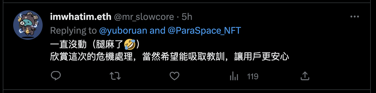不只是当下受到损失的用户,现在其他用户想要回归将资金存回ParaSpace,Yubo也会协助支付Gas费,当前目前所有想要退费的用户需要私讯Yubo推特,已经有不少用户与Yubo成功接洽并收到补助。
