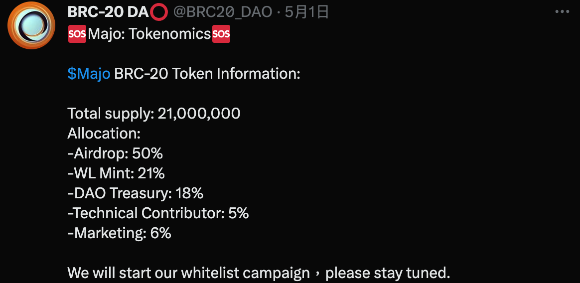 根据BRC-20DAO所公布Majo的发行规则,总量为21,000,000,详细分配如下: