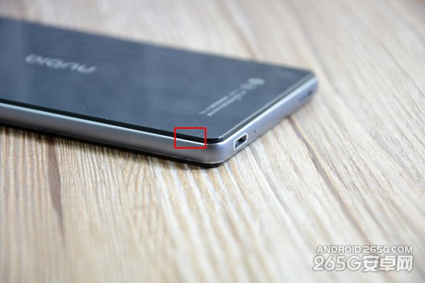 努比亚Z9 mini的后盖是可以拆开的,而扩展卡插槽就在手机的背后。具体打开努比亚Z9 mini后盖的方法也很简单,首先找到下图用红框标出的缺口: