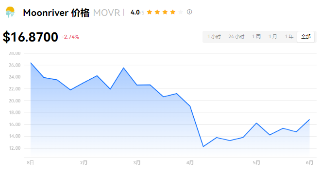 Moonriver 当前价格为 $16.8700。Moonriver 的价格在过去 24 小时内下跌了 -2.74%。目前,Moonriver 市值排名为第 175 名,实时市值为 $1.51亿,流通供应量为 8,978,255 MOVR,最大供应量为 11,334,707 MOVR。我们会实时更新 Moonriver/USD 的价格。Moonriver 价格表现 (美元)