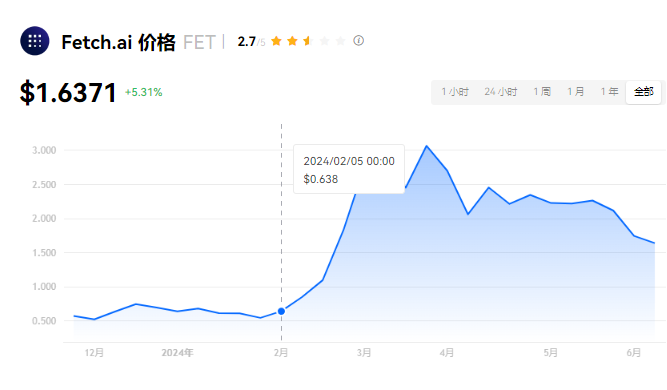Fetch.ai 当前价格为 $1.6371。Fetch.ai 的价格在过去 24 小时内上涨了 5.31%。目前,Fetch.ai 市值排名为第 27 名,实时市值为 $41.38亿,流通供应量为 2,521,012,371 FET,最大供应量为 2,630,547,141 FET。我们会实时更新 Fetch.ai/USD 的价格。Fetch.ai 价格表现 (美元)