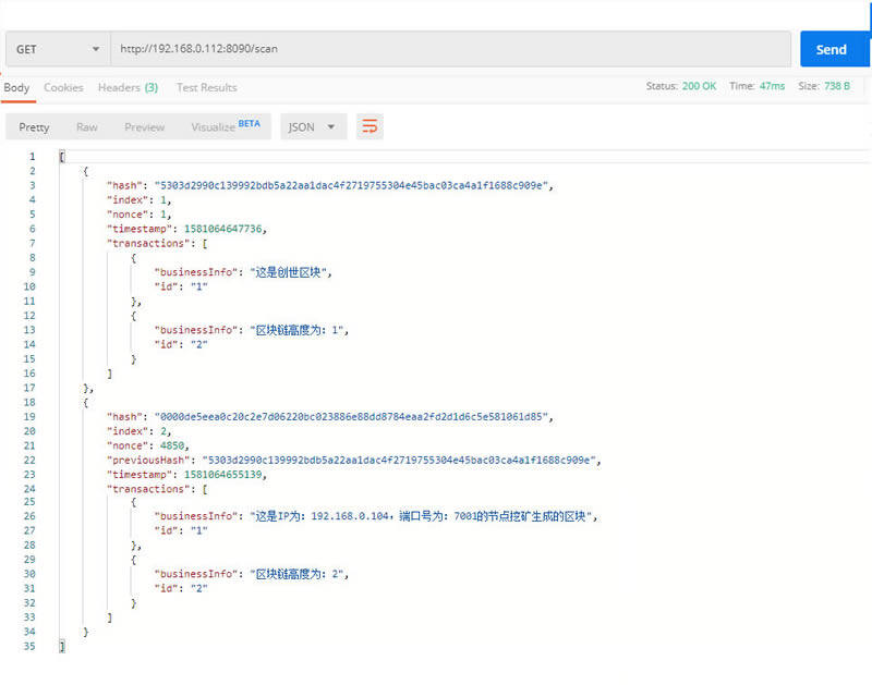 最后,我们来验证节点2是否已经完成了节点1生成的区块链信息的网络同步,Postman执行http://192.168.0.112:8090/scan请求,查看返回结果: