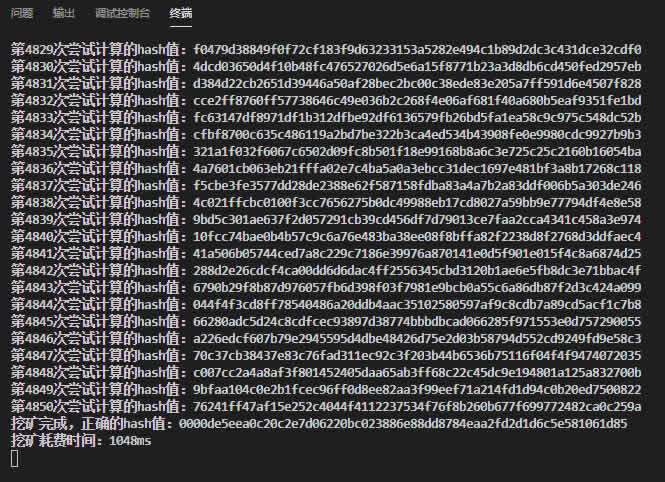 我们来看一下,系统后台计算的过程,此次计算共花费1048ms计算出满足条件的Hash值,共计算4850次: