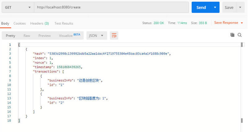 首先执行http://localhost:8080/create方法,生成创世区块。