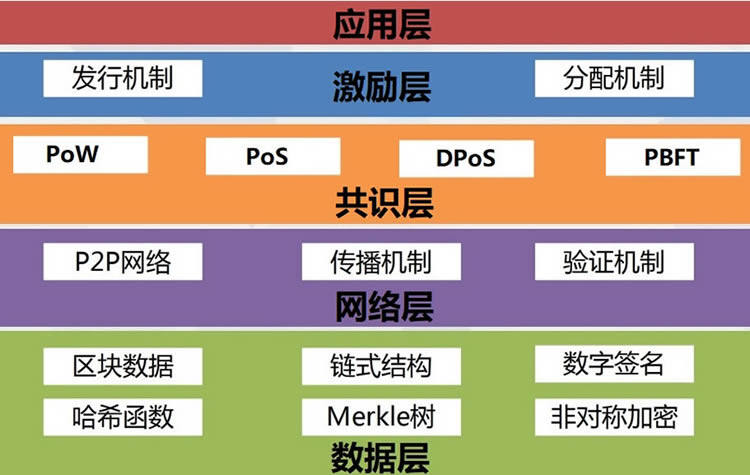 目前主流的区块链技术架构主要分为五层,数据层是最底层的技术,主要实现了数据存储、账户信息、交易信息等模块,数据存储主要基于Merkle树,通过区块的方式和链式结构实现,而账户和交易基于数字签名、哈希函数和非对称加密技术等多种密码学算法和技术,来保证区块链中数据的安全性。