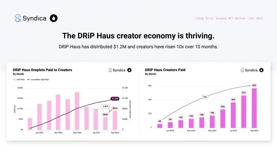 幻灯片提到低交易成本推动新消费行为,这一点可以通过 drip haus 的例子得以很好地说明。自 2023 年 3 月以来,该平台共实现了 1.82 亿个 NFT 铸造,总成本仅为 1600 SOL(按 SOL 价格 150 美元计算,每个 NFT 仅需 0.001 美元),正如 ledger top 所指出的。