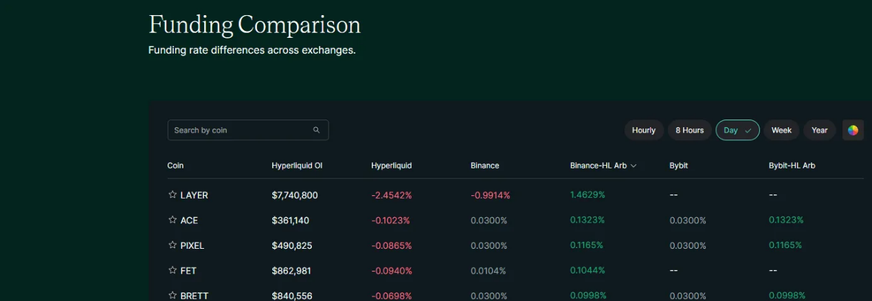 目前,Ethena与Resolv等协议已开发自动化资金费率套利系统,为用户提供被动收益。然而,通过手动操作多品种套利策略,尽管较为耗时,但仍可能获得更高收益。投资者可以使用Hyperliquid平台的”Funding Comparison”功能板块寻找套利机会。