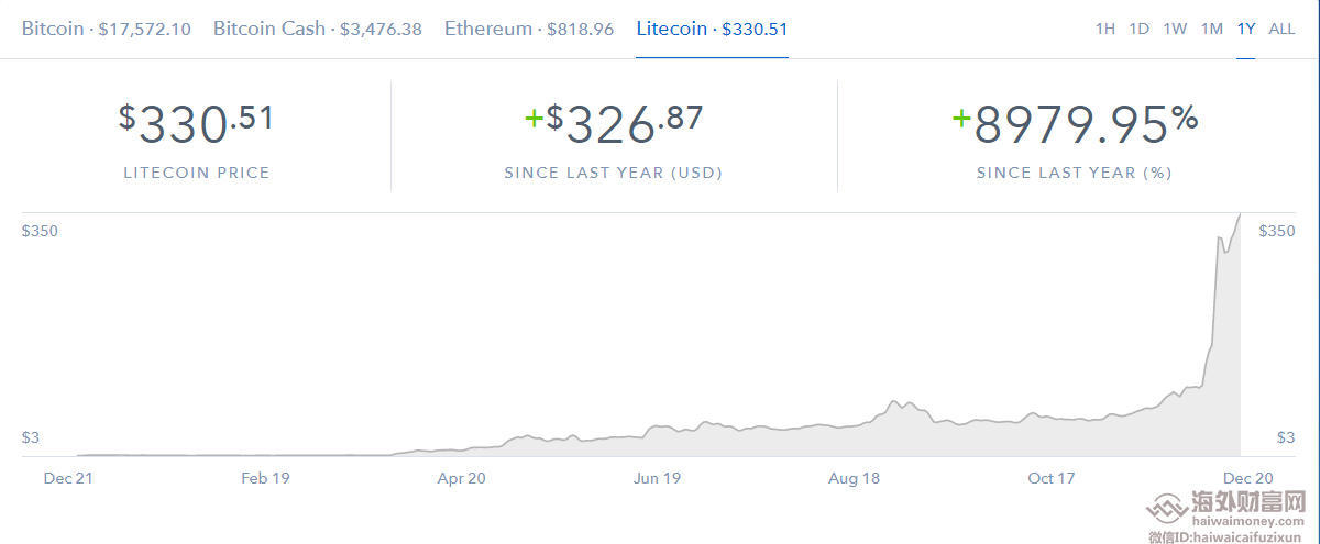 目前莱特币价格依然高于330美元,这意味着一年内莱特币价格涨幅超过90倍。不过受到黑客攻击、监管机构干预等一连串坏消息的影响,莱特币周三下跌逾7%,随大部分数字货币走低。