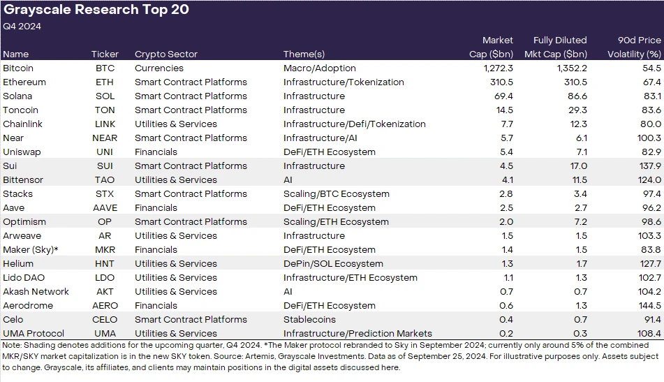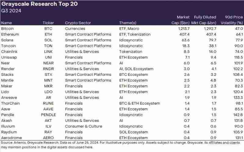 通过自己的研究, 灰度推出了本季度(2024 年第三季度)具有高增长潜力的前 20 名代币。