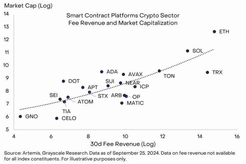 与主导加密领域的比特币不同,以太坊在智能合约平台面临着激烈的竞争。今年,许多山寨智能合约平台获得了关注,包括 Solana、Toncoin、Tron 和 Near,以及像 Sui 这样的新平台。这些资产都在争夺费用收入,而一些智能合约平台提供的“丝滑”用户体验可能导致以太坊L1的费用市场份额下降。