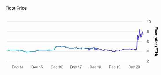 虽然价格随后有所回落,但目前地板价仍维持在7.9ETH(约合26,860美元)左右,24小时涨幅仍达到78.5%。
