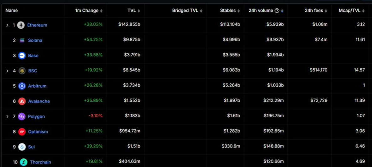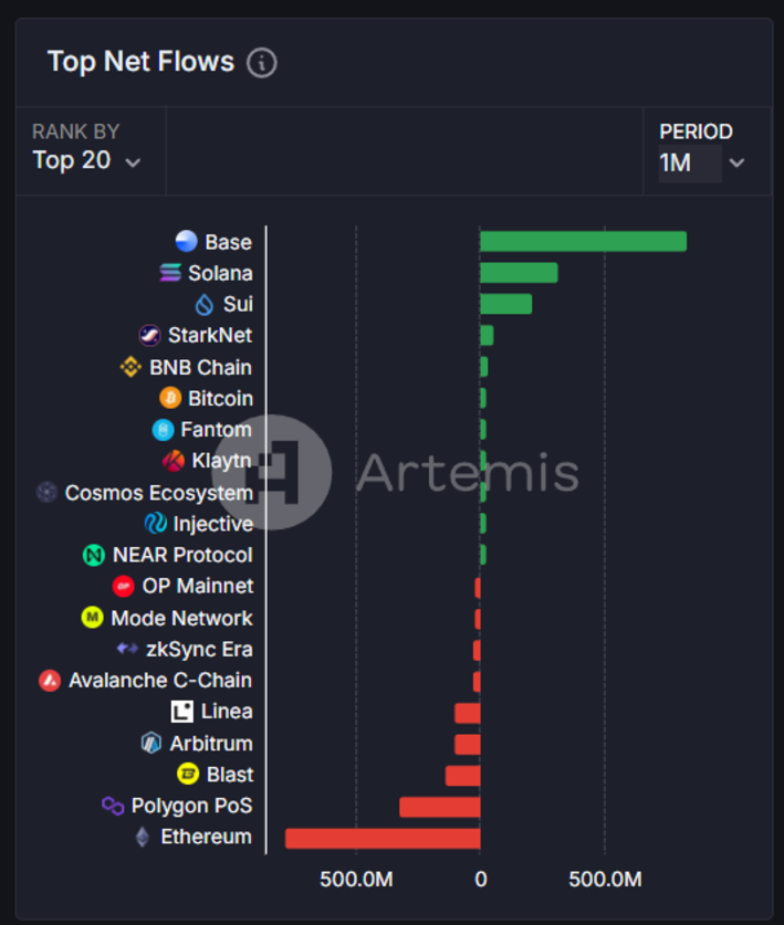 我们来谈谈流动性。稳定币流通量为35.4亿美元。最具指示性的数据是跨链流动,仅上个月的净流入就达7.56亿美元,三个月的总流入为12亿美元,是Solana流入量的两倍。