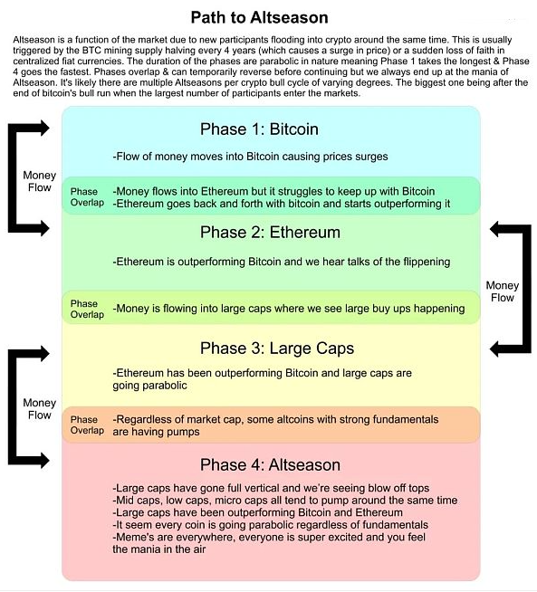 在BTC暴涨之后,大家会开始觉得BTC已经没有多少回报潜力了。获利者也想将部分BTC挪仓到回报更高的项目。之后资金会流入ETH,使其超过BTC的表现。这是第二阶段。接着资金会流入大盘股代币,使它们呈现抛物线走势。这是第三阶段。最后资金会流入中小型代币和其他垃圾币。这是第四阶段。当市场过热时,一些人会开始撤出,加密货币价格进入下行螺旋。这是理解加密货币资金流动的一个简化模型,并不严格,不要较真,心里有个谱就行。每个阶段可能会有重叠或暂时反转,关键是要领先资金流动的总体方向。