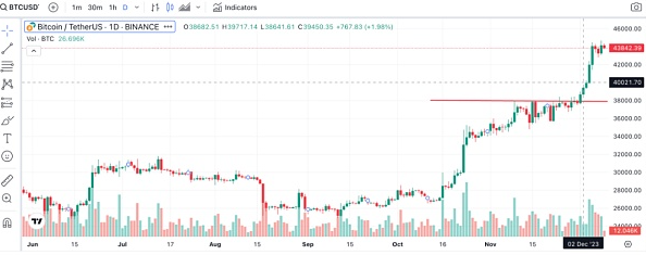 正如以往的周期规律那样,牛市通常始于比特币的大幅上涨。这是资金流入加密市场的第一阶段,现货ETF的预期和传言促使每个投机者都试图进入加密市场,推高BTC的价格和主导地位。我们现在正处在这一阶段。