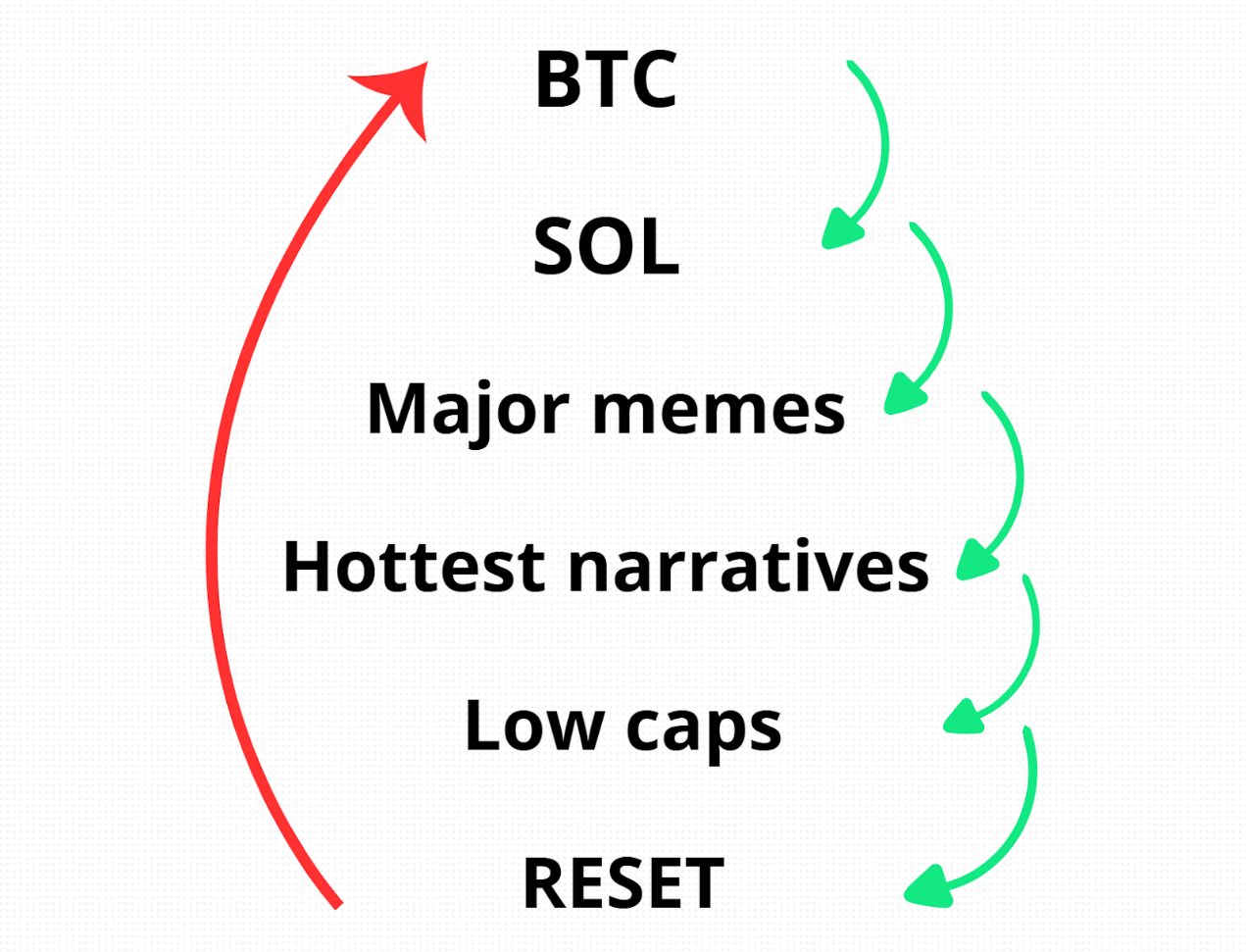 资金不断在不同代币之间流动,这就是为什么山寨季不只持续一周,而是持续数月。以往资金流动情况如下: