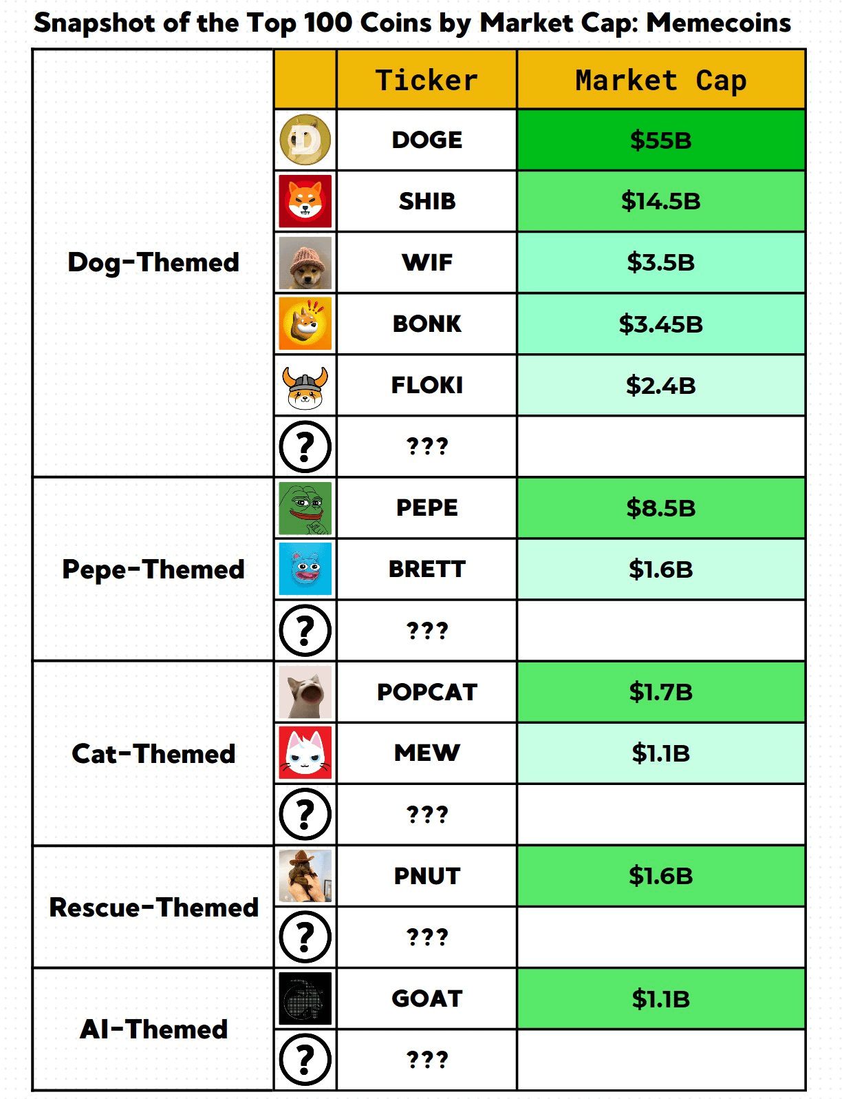 - 主流 memecoin:DOGE、SHIB、PEPE、WIF、BONK、POPCAT