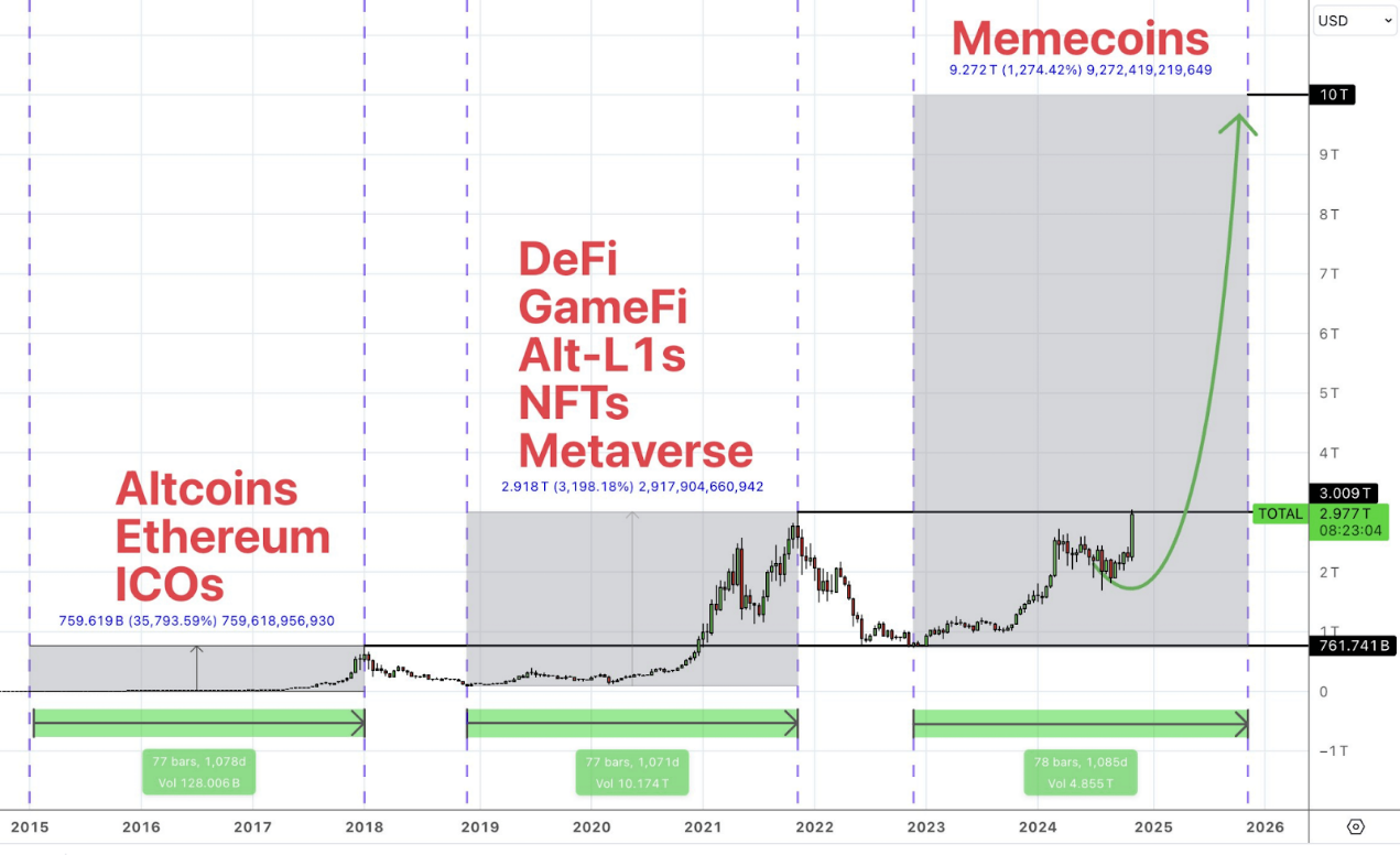 在此阶段,低市值代币开始快速上涨,甚至每小时上涨一次。该阶段是稳健的 memecoin 和基本面较好项目的最佳交易时机。选择表现最佳的代币,因为经常会出现市场暴涨暴跌的情况。