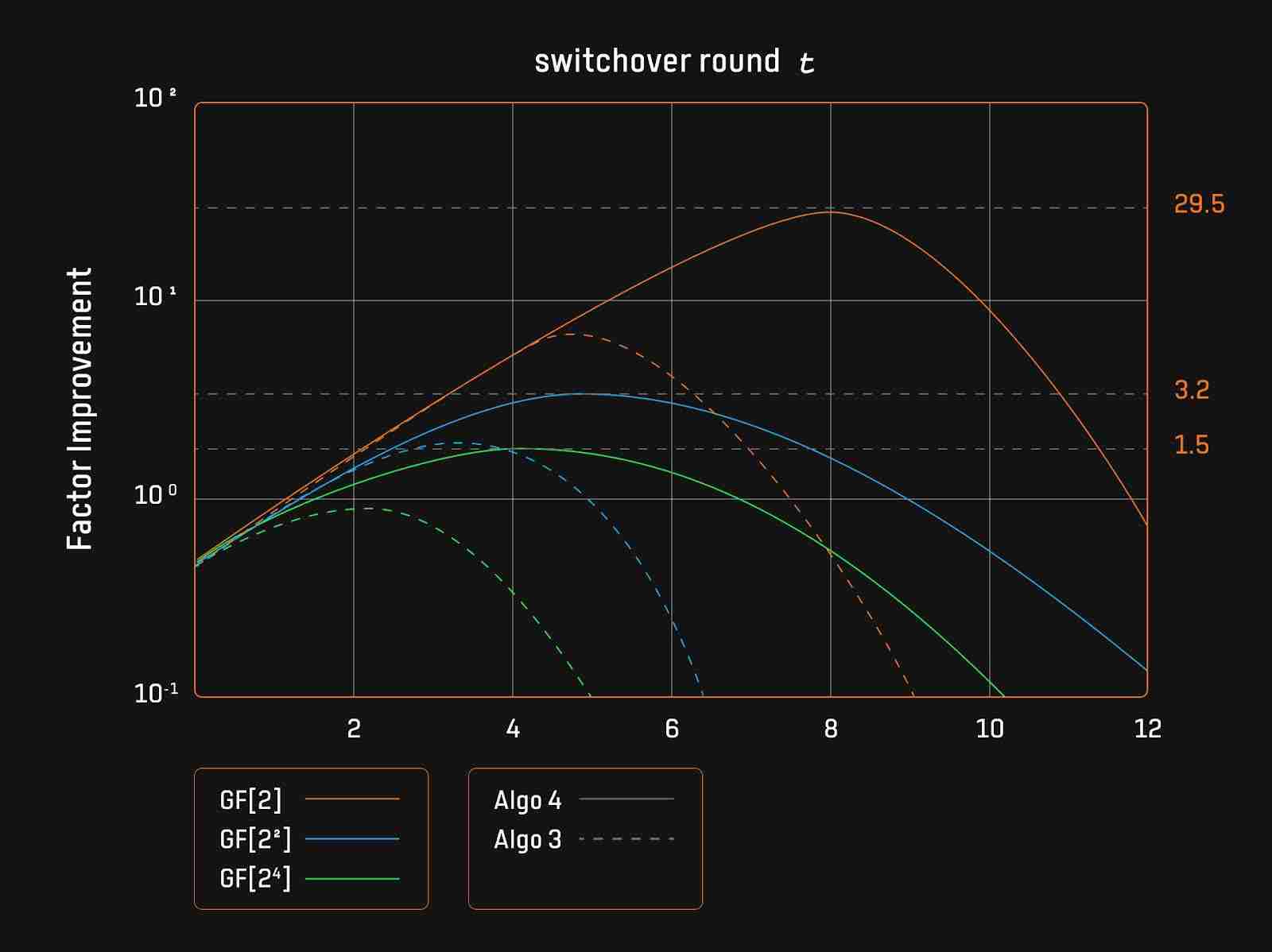 基于小域的Sumcheck协议的改进集中于切换轮次t的选择。切换轮次是指从优化算法切换回朴素算法的时间点,论文的实验表明,在最佳切换点时,改进因子达到最大值,随后呈现抛物线趋势。如果超过这一切换点,优化算法的性能优势减弱,效率下降。这是由于小域上的基域乘法与扩域乘法相比有更高的时间比率,因此在适当时机切换回朴素算法至关重要。