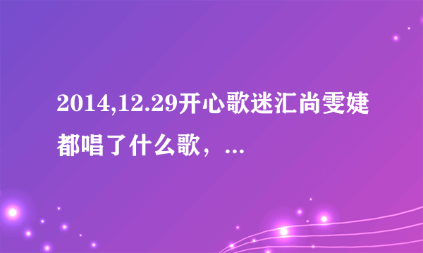 2014,12.29开心歌迷汇尚雯婕都唱了什么歌,有一首很好听可是不知道歌名 更新时间:2024-05-07 04:48:59 •阅读 0 2014,12.29开心歌迷汇尚雯婕都唱了什么歌,有一首很好听可是不知道歌名的有关信息介绍如下: 最后唱的那首是《最终信仰》